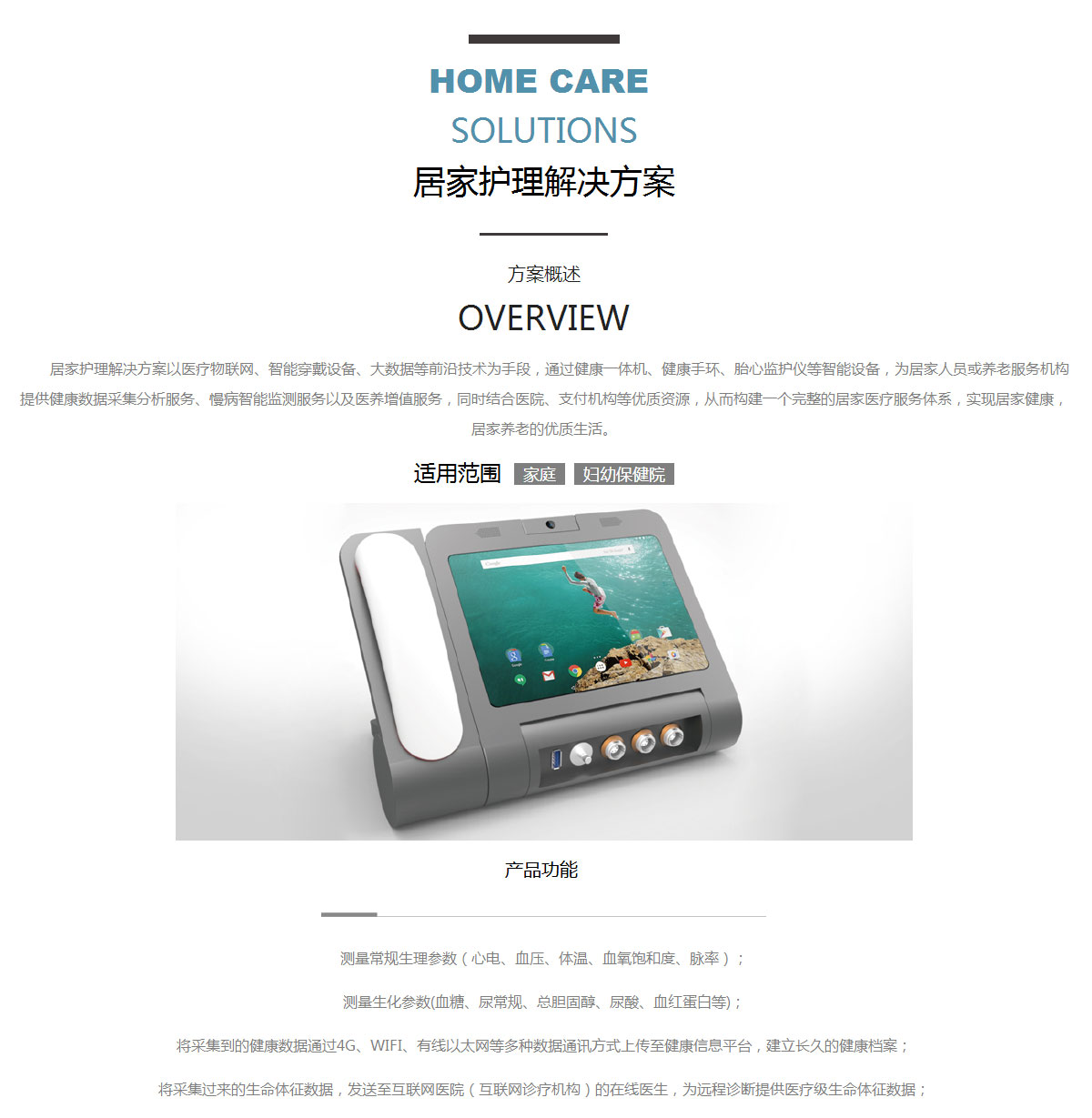 居家護(hù)理解決方案以醫(yī)療物聯(lián)網(wǎng)、智能穿戴設(shè)備、大數(shù)據(jù)等前沿技術(shù)為手段,通過健康一體機(jī)、健康手環(huán)、 胎心監(jiān)護(hù)儀等智能設(shè)備,為居家人員或養(yǎng)老服務(wù)機(jī)構(gòu)提供健康數(shù)據(jù)采集分析服務(wù)、慢病智能監(jiān)測(cè)服務(wù)以及 醫(yī)養(yǎng)增值服務(wù),同時(shí)結(jié)合醫(yī)院、支付機(jī)構(gòu)等優(yōu)質(zhì)資源,從而構(gòu)建一個(gè)完整的居家醫(yī)療 服務(wù)體系,實(shí)現(xiàn)居家健康,居家養(yǎng)老的優(yōu)質(zhì)生活